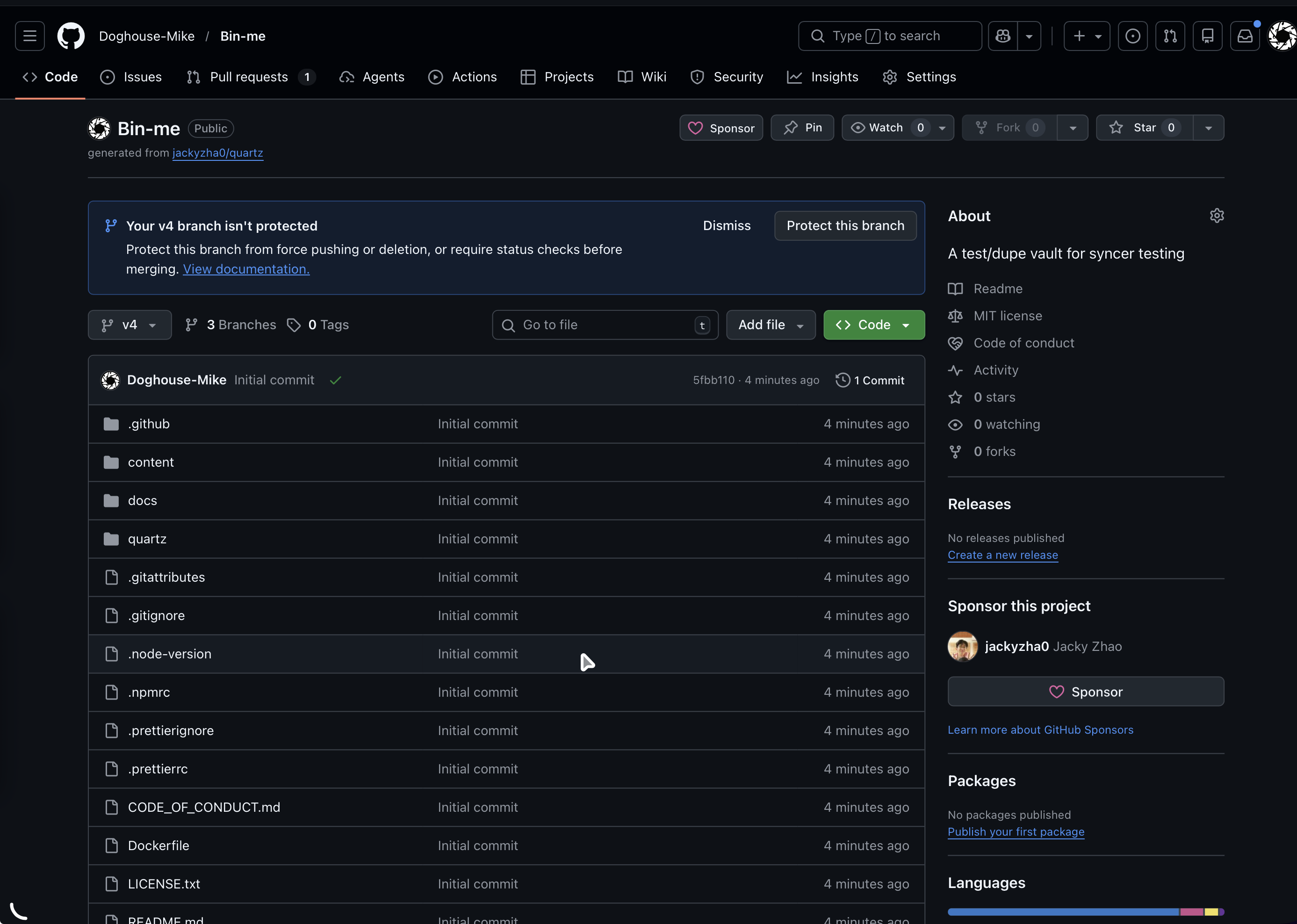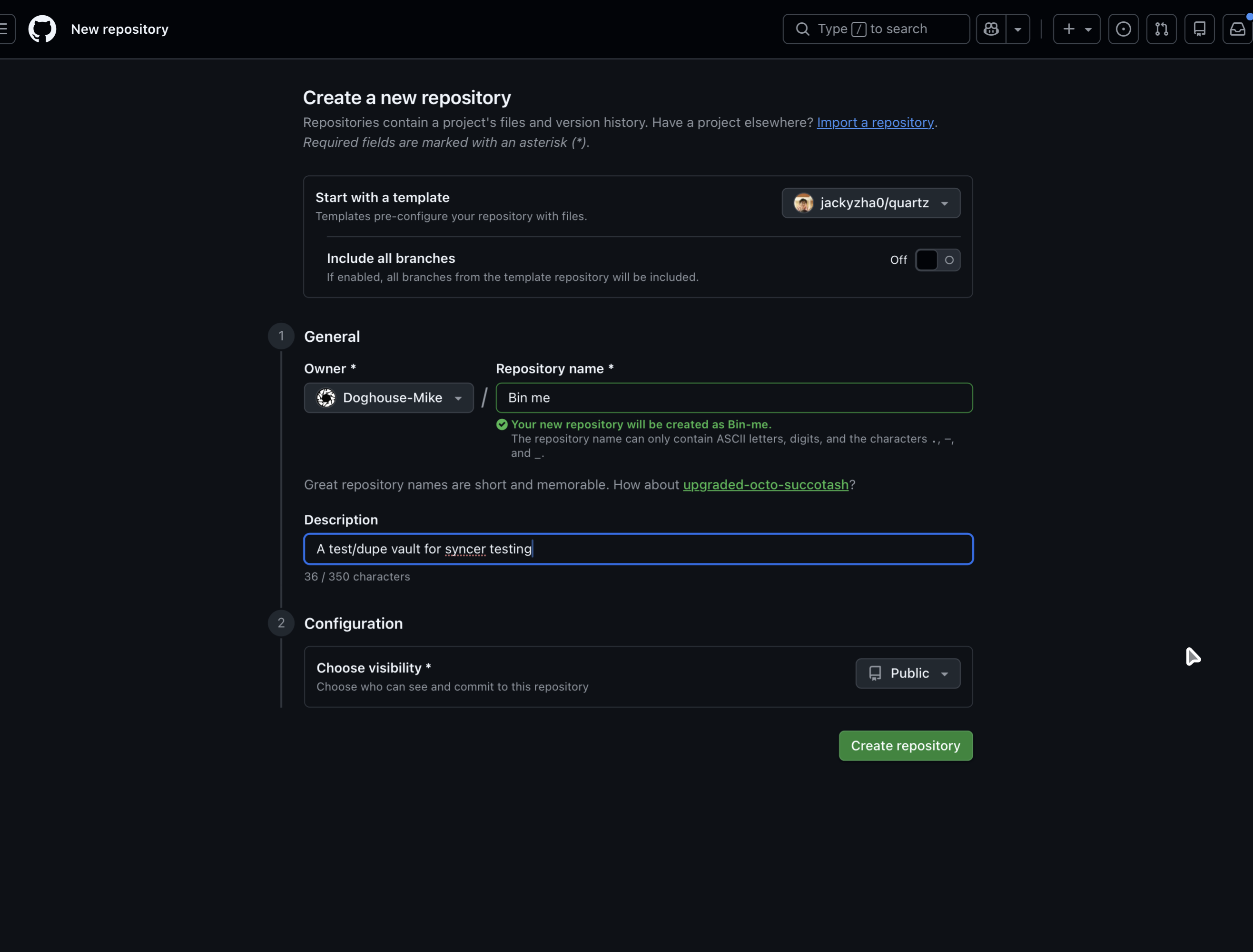 Prompted by some chats in the discord, a (hopefully) straightforward guide to getting Quartz set up with Obsidian. Mostly following the official docs. One could probably skip the first couple of steps if you’ve already got a Quartz repo, but this is a test to show you don’t need a local install of Quartz. I think I’d still prefer to have that local copy so a manual npx quartz sync etc remains available, even if 99% of the time publishing will be handled by the plugin. Then again, I guess that could be set up later if required.